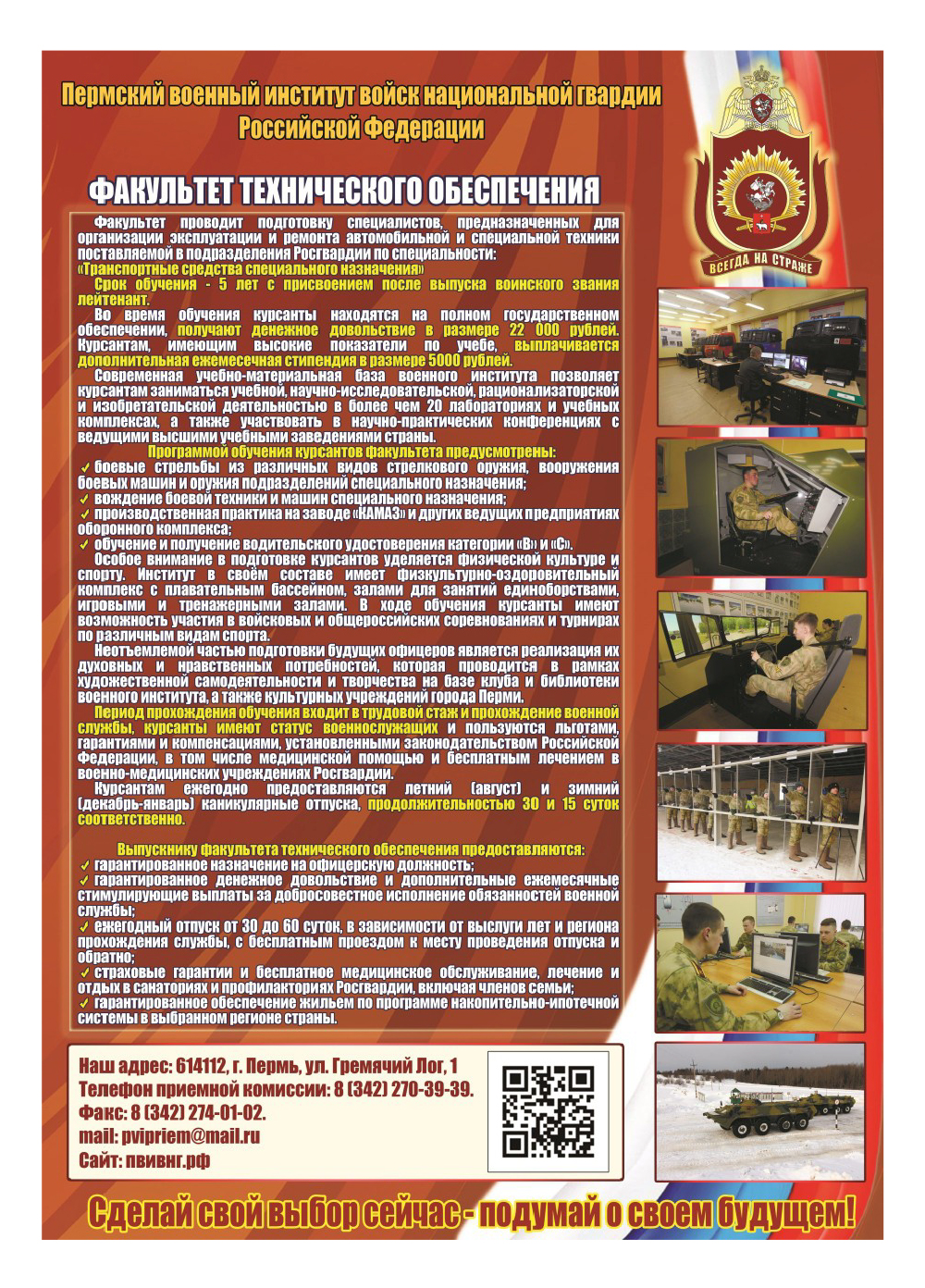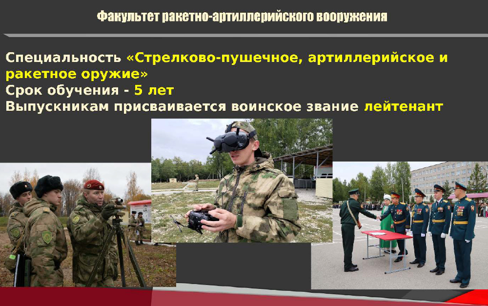 Проводится набор курсантов для обучения по программе высшего образования (уровень образования – специалитет) на факультет технического обеспечения по военной специальности 23.05.02 «Транспортные средства специального назначения» со сроком обучения 5 лет. По окончанию обучения выпускникам присваивается квалификация «инженер» и воинское звание «лейтенант».