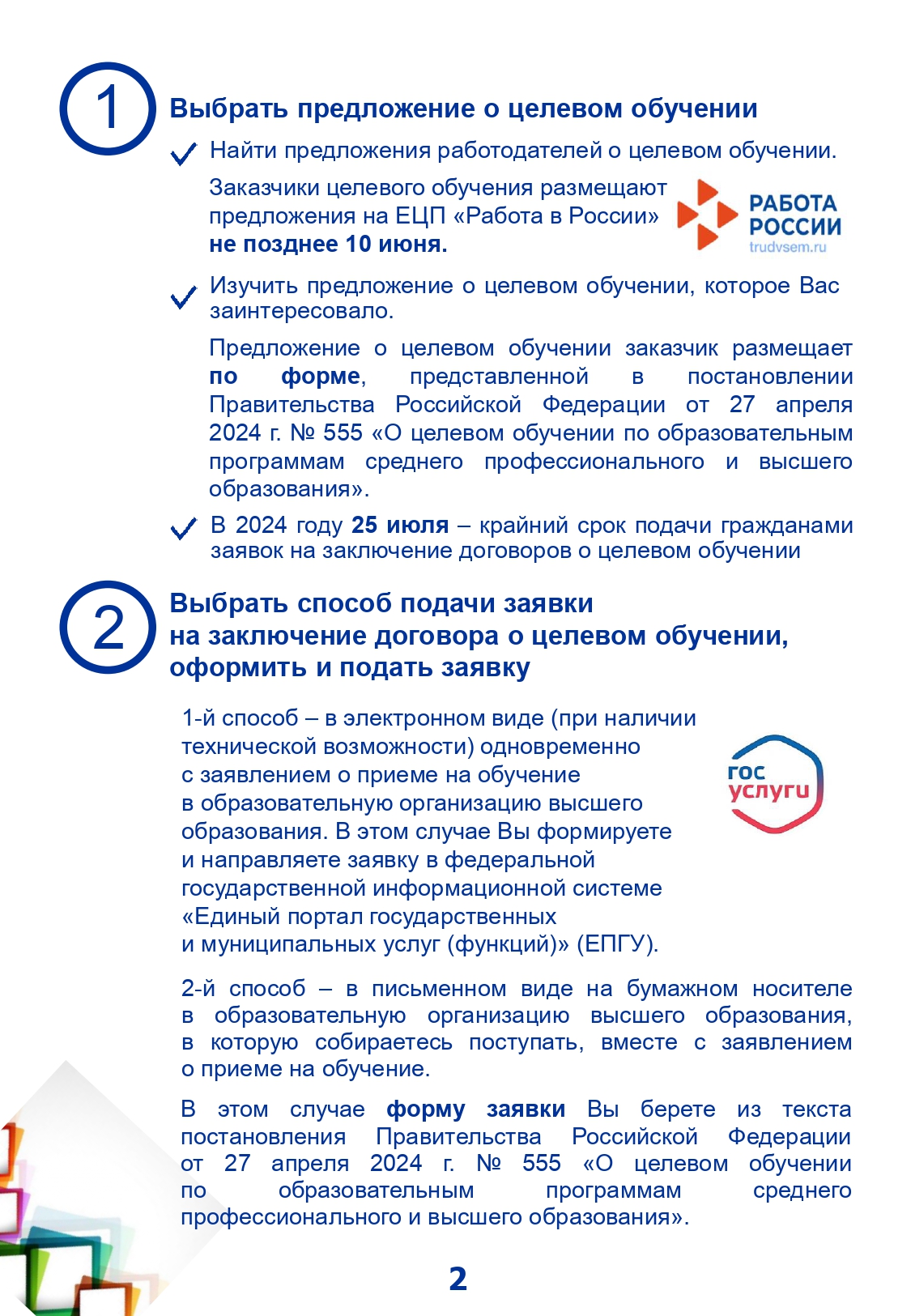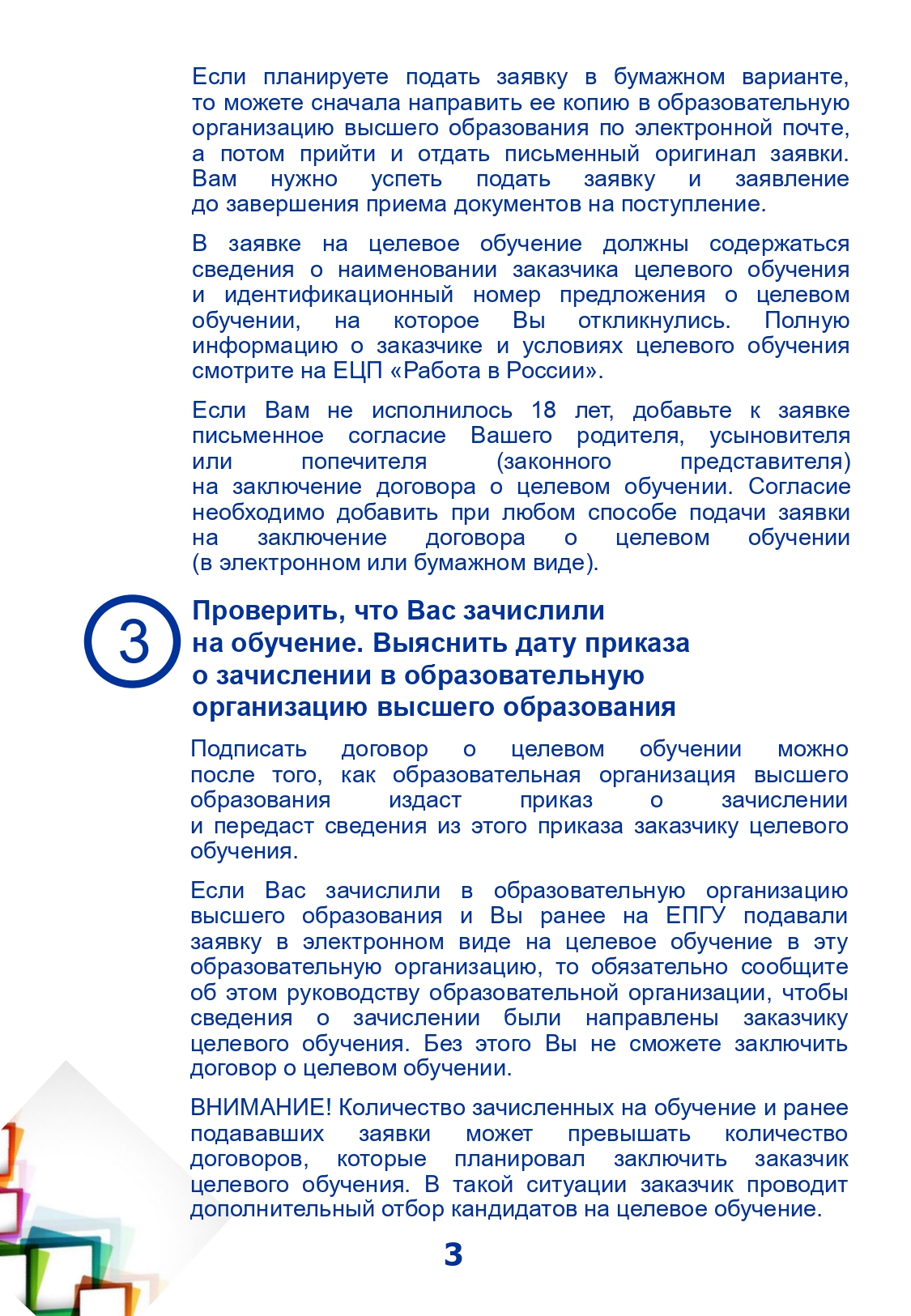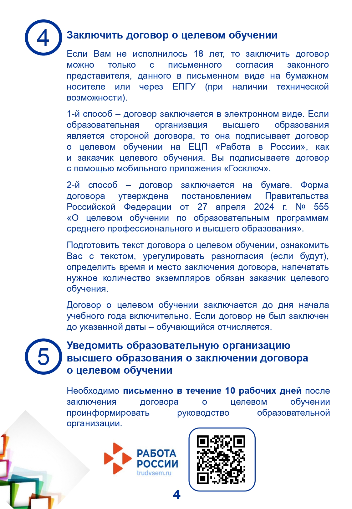 Информация в части образовательных программ высшего образования размещена на официальном сайте Минобрнауки России в подразделе «Целевое обучение» раздела «Деятельность» (https://minobrnauki.gov.ru/action/targeted_training/). Указанный подраздел содержит информационные материалы для работодателей, образовательных организаций, абитуриентов и обучающихся, а также других заинтересованных сторон. Информационные материалы включают в себя записи вебинаров, презентационные материалы, методические рекомендации и официальные письма Минобрнауки России, направленные в адрес высших исполнительных органов субъектов Российской Федерации, образовательных организаций и заинтересованных федеральных органов исполнительной власти.